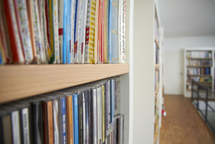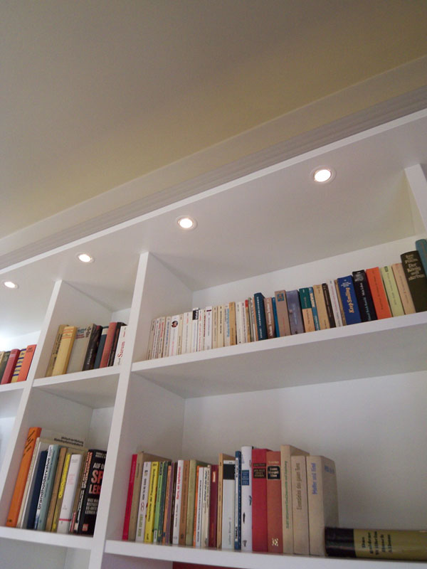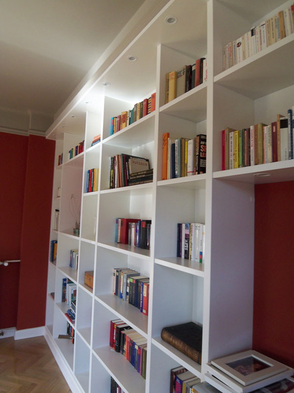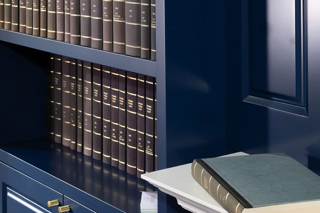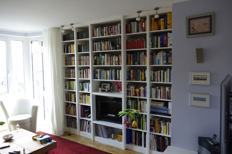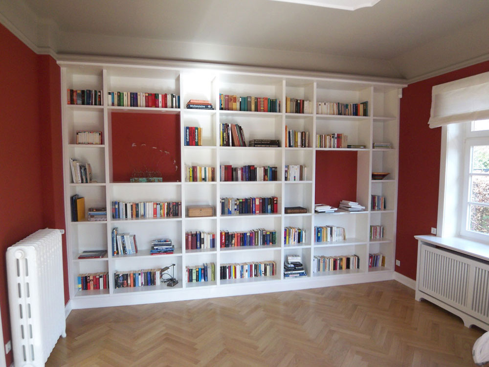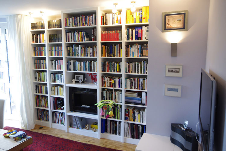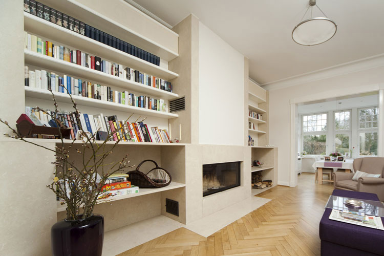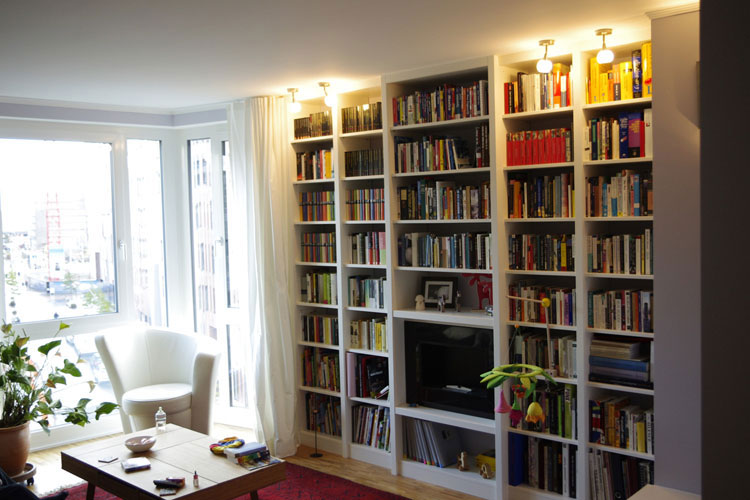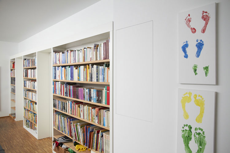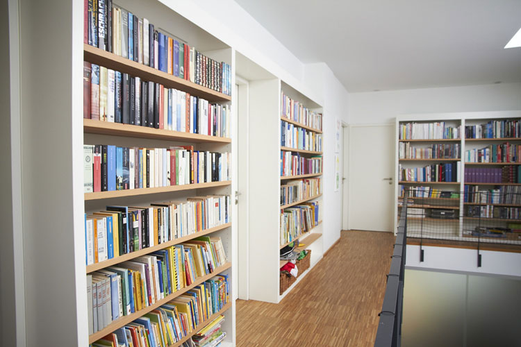 Klare, übersichtliche Regalelemente, die den Raum strukturieren. Hier finden nicht nur Bücher ein ordentliches Zuhause.