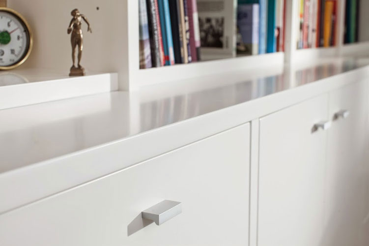 Helle, klare Einbauten mit Raum für Nützliches, Deko und Wohnaccessoires.