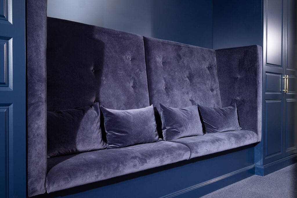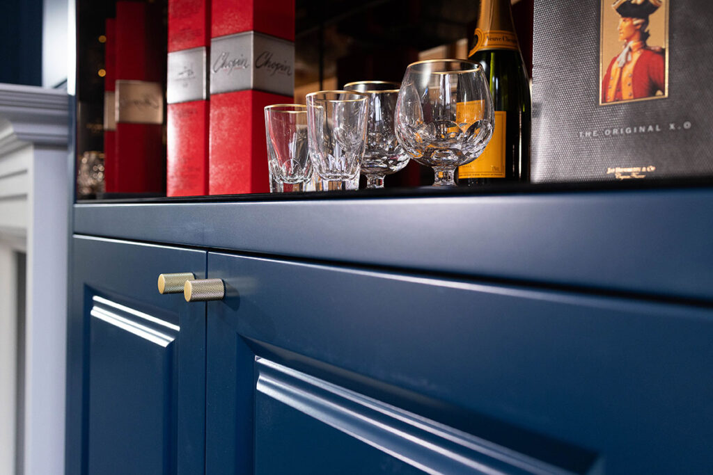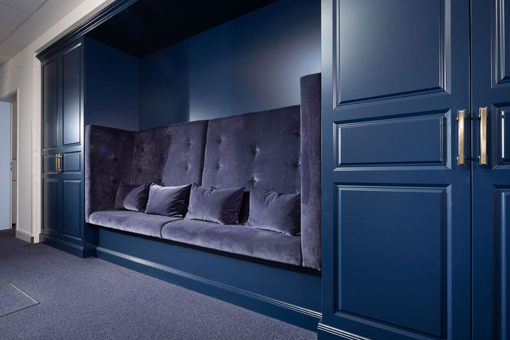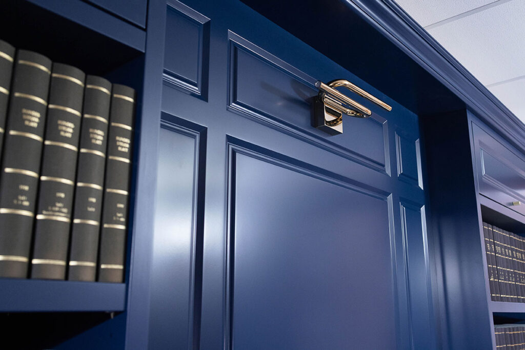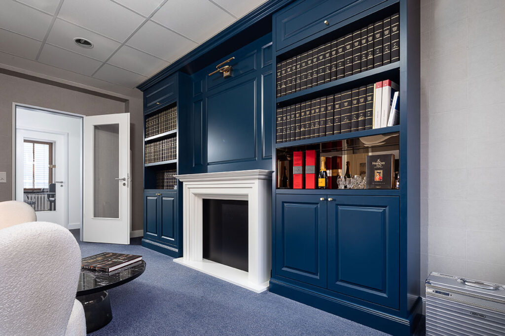 Bibliothek in Blau lackiert mit Kamin und Sitzecke.