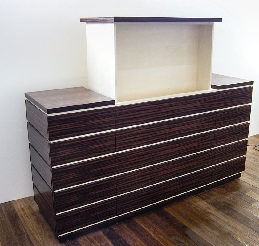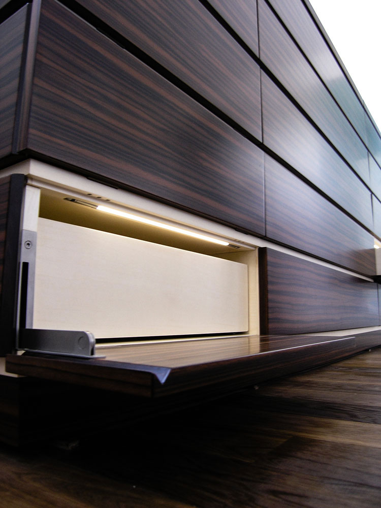 Auf den ersten Blick ist es nur eine Kommode, aber hier versteckt sich ein ausgefeiltes Hifi-Möbel mit TV-Lift, integrierter Beleuchtung und sehr viel Liebe fürs Detail.